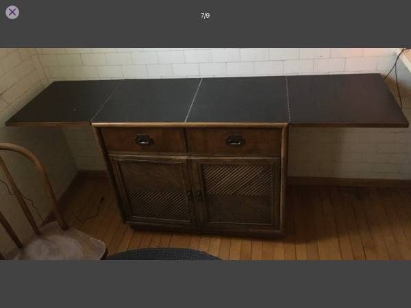 Has two doors with a shelf, two drawers, and folds open to double the serving area. It is wonderful for entertaining and parties.