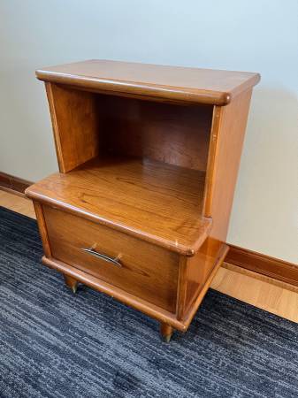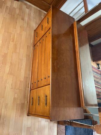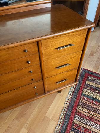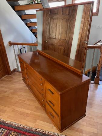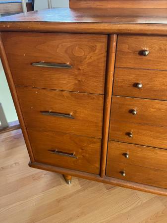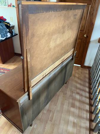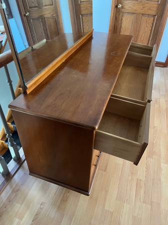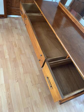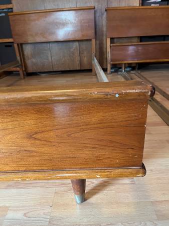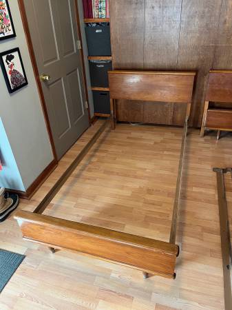 Two twin size bed frames, headboard & footboard. One night stand. Dresser with attached mirror. All matching wood finishes. Selling as a complete set.