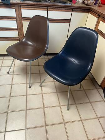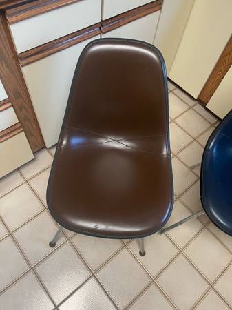 Pair of brown and blue Herman Miller chairs. Brown one is nicer. Blue chair has more corrosion and a few more marks on the vinyl. Both perfectly solid chairs.
