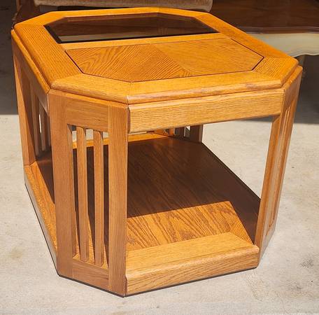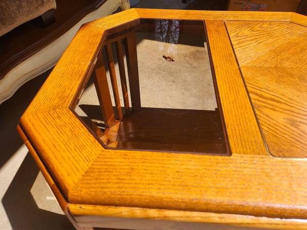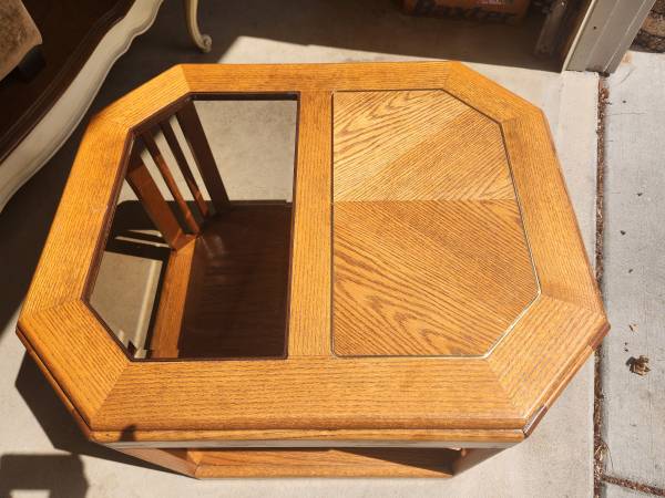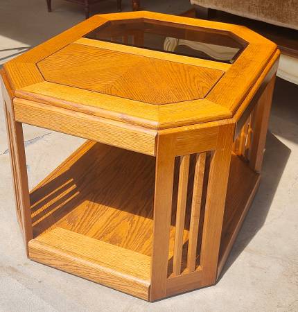 Oak side table with beveled glass accent. Glass has a couple of very minor scratches, nothing notable. Great condition. 25" x 30" x 20.5" tall.