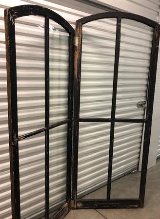 Pair of vintage, oversized windows hinged together to create a room divider/screen.