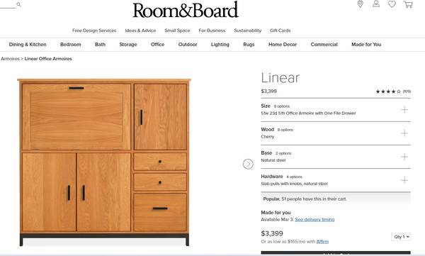 I'm asking $600 or will consider best offer. You can still get this armoire at Room & Board, the design has only been slightly updated and lists for $3,399 brand new.