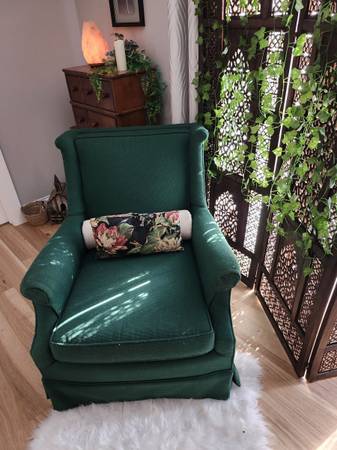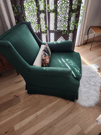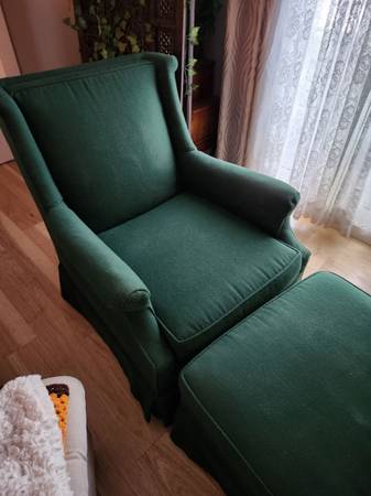 Forest green vintage chair and ottoman. Has been reapolsterd. Great condition. Good for smaller people