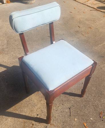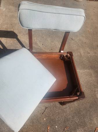 Vintage upholstered chair with built-in storage (originally for sewing notions). Compartment space is 13" x 15.5" x 2" tall. 17.5" wide x 15.5" deep x 30" tall.