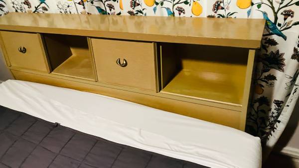 Headboard, footboard, and rails that can convert between queen and full sized. Sliding doors for adjustable hidden headboard storage. Shown in pics with queen configuration.