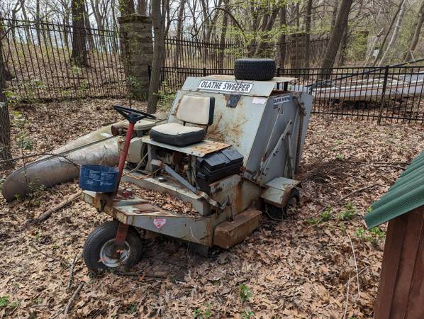 Olathe Lawn Sweeper. Not pretty but it works as it should. Newer Onan motor. Starts and runs and sweeps very well. Many spare parts included.