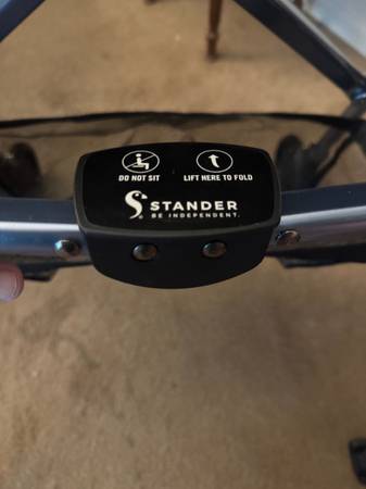 Stander roller walker, cobalt blue, never used. Two wheels in front with gliders in the back. It has a basket and a front pouch. Spare gliders with it.
