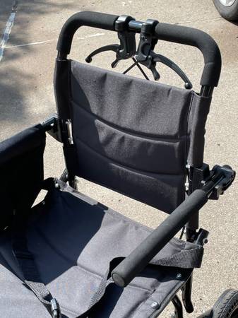Lightweight, more compact, transport wheel chair. Collapsible front to back, armrest folds up, for easier storage/transport (with a bolt removed). Weight limit unknown Pickup in New Brighton 55112
