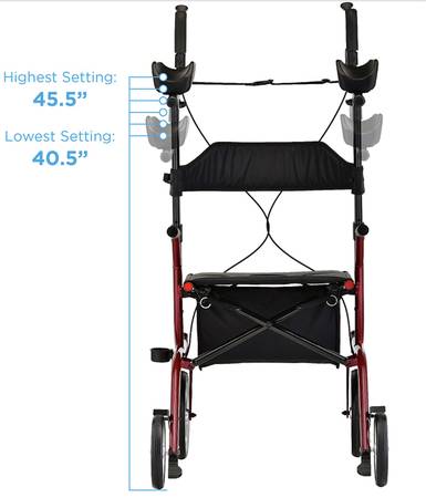 Foldable wheeled walker w/ seat and backrest. Allows walking with natural posture, and can be used as a hip-height walker too. Upper handles have comfortable forearm rests. Locking hand brakes. Stable frame, 10-inch front and 8-inch rear rubber wheels good for indoors and out. For up to 6' tall. Foldable and lightweight aluminum frame (~20lbs). Used just once--it's not the right tool for our elder!