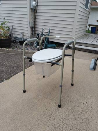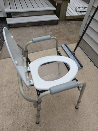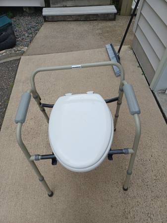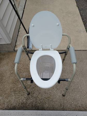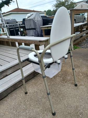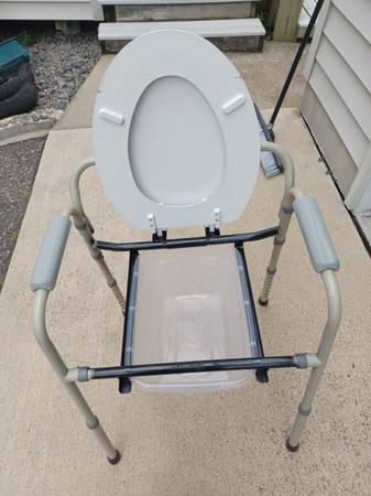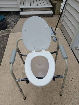 Porta Potty customized to fit full size elongated toilet seat. Couldn't find a comfortable unit for my dad so I bought a new standard long seat and made this up for him. Seat lid makes a great back...