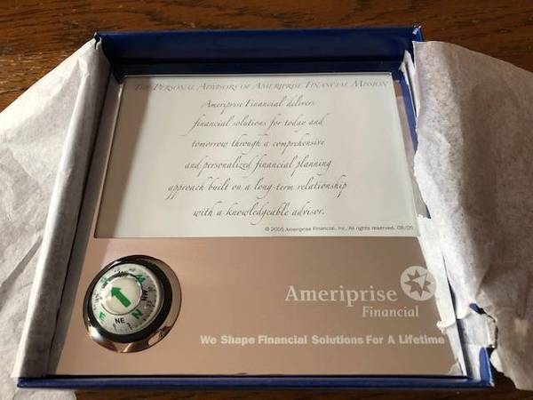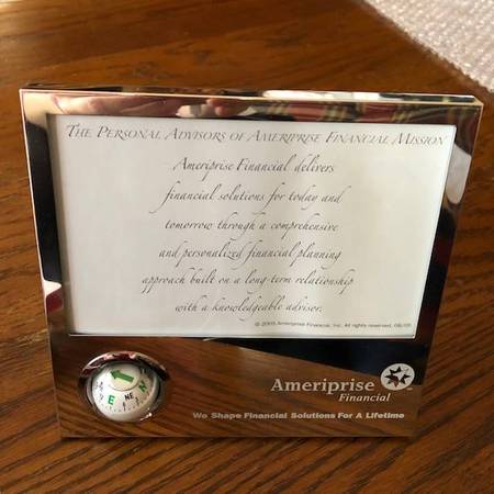 Silver picture frame with compass and Ameriprise Financial engraving. Has a black velvet backing with a tabletop stand. Includes original box and packaging. Holds a 4x6 photo. From a non-smoking...