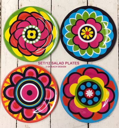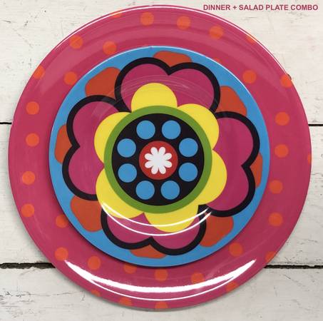 23-Piece Set of French Bull Outdoor Boho Dining Platter, Dinner + Salad Plates Set of (23) pieces: ( 1) Platter: 15.5" dia. (Paid $55 new) (10) Pink/Orange Polka Dot Dinner Plates: 11" dia. (Paid...