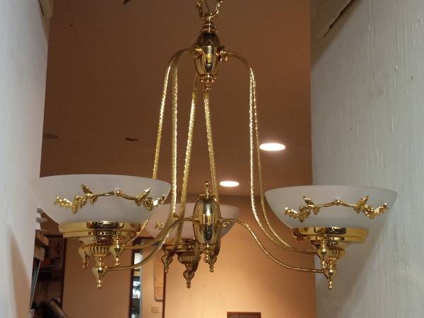 Beautiful REAL 24K Gold Plated ceiling light chandelier. 27" overall Width. 27" Ht. 30" Chain length. 10" Diameter Glass Shades.