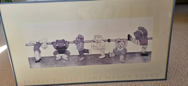 Jane Mason Burke's art print Bearly Ballet......32 1/4 x 17 1/2......... sky blue metal frame, cream colored mat. Would make a great gift...............$5......call or text
