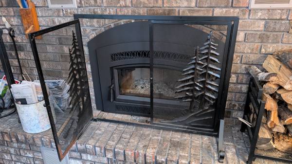 38" wide by 31" tall. Two doors with magnetic catches. Slight rust at bottom of door opening. Has two adjustable feet at the back to fit inside your hearth. Texts only please. If the ad is still up...
