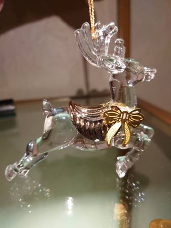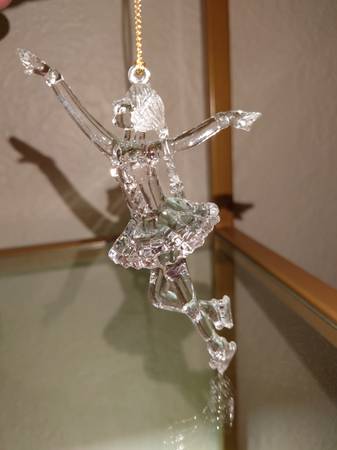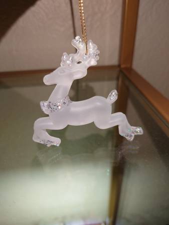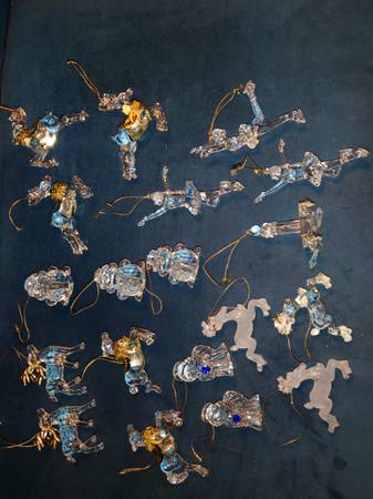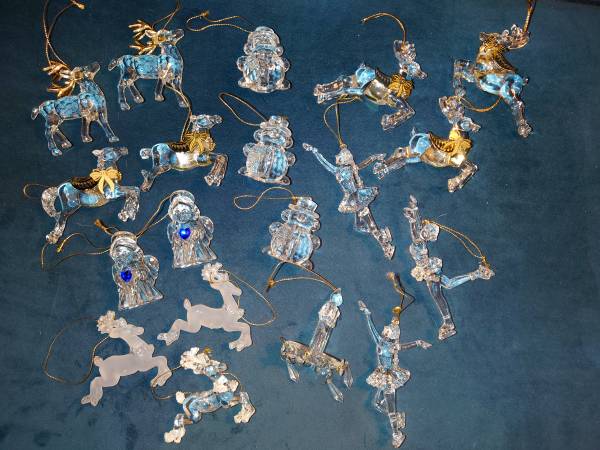 Lovely set of clear and frosted acrylic holiday tree decorations. Set of 19 includes: 8-reindeer in various design 3-snowman 3-ice skater, two poses 2-horse 2-angel 1-candle chandelier All with gold hanging string.