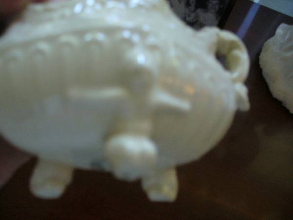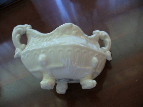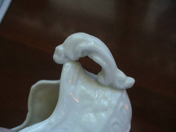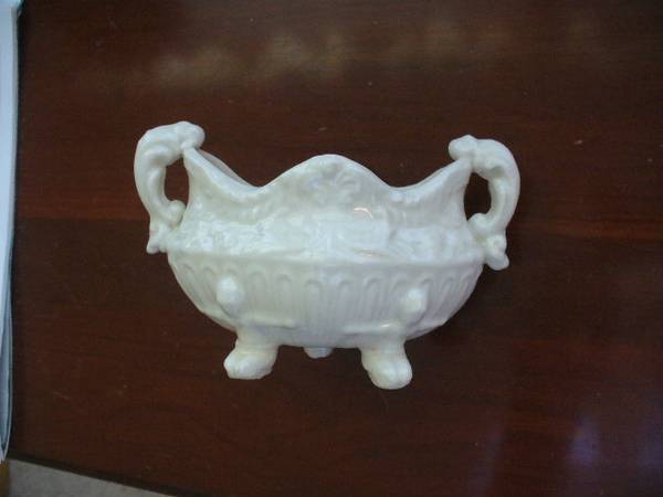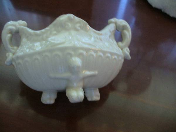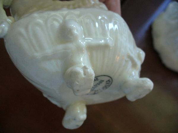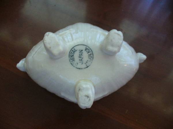 This 3 footed Majolica Putti Trinket Dish from Japan features a unique design of sea urchins, measuring 5 inches in length. Made of ceramic with a glossy white/cream finish, the oval-shaped dish is a vintage piece with a touch of Oriental elegance. The trinket dish is perfect for storing small items and adds a decorative touch to any room with its intricate Majolica production style. Perfect for collectors of decorative cookware, dinnerware, and serve ware.