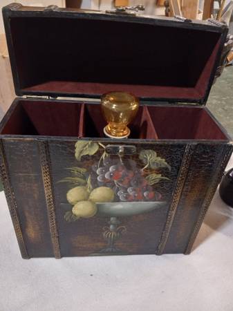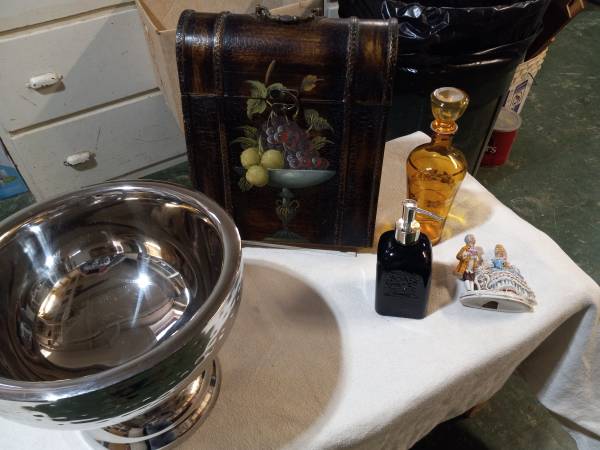 Large Bowl 12" Diameter 9 1/2" Ht. Decorative Bottle Chest. Holds 3 Bottles. 11 3/4"w x 4 1/2"d x 13 1/2"ht. Soap Dispenser, new never used. All for $15.
