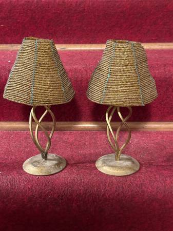 Set of two tea light candle holder lamps with unique twisted metal bases and beaded shades.