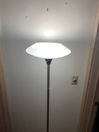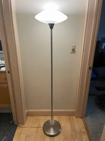 Silver metal floor lamp with round glass shade - 65” tall, 14” diameter glass shade. No labels so do not know the designer/manufacturer Works well. $35 - cash only please