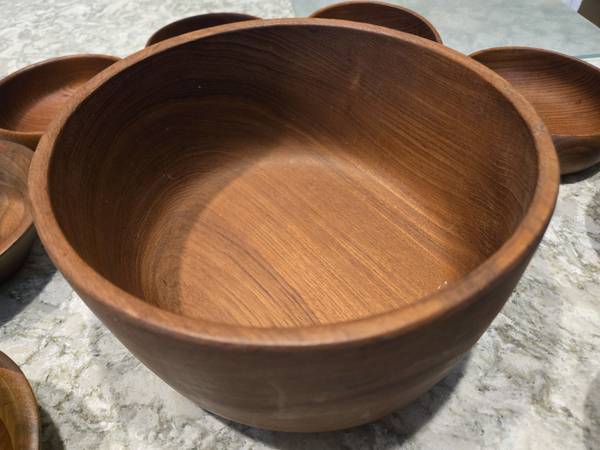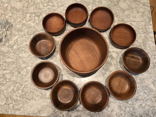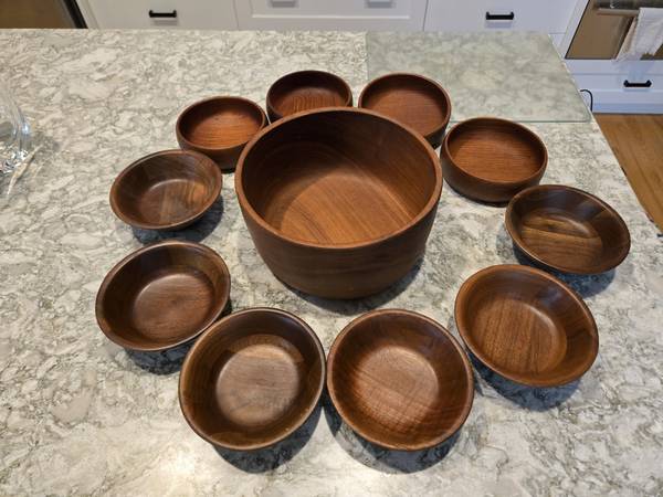 Offering this beautiful, Mid-Century Modern teakwood salad bowl set, which includes a large bowl and TEN small bowls, handmade. Four of the smaller bowls are teak wood, and six more are walnut. All in perfect condition, solid wood. I do not believe they have been used. These were on display in my late Mom's home.