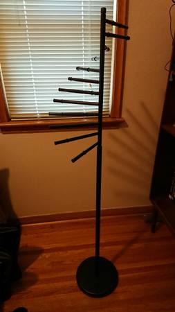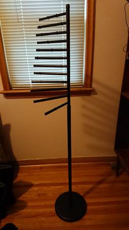Floor standing pivoting accessory organizer rack. Great for scarves, ties, belts, jewelry! Each of 12 arms pivot 360 degrees. Material metal Color bronze Height 58" Weighted base 10.5" diameter Arms...