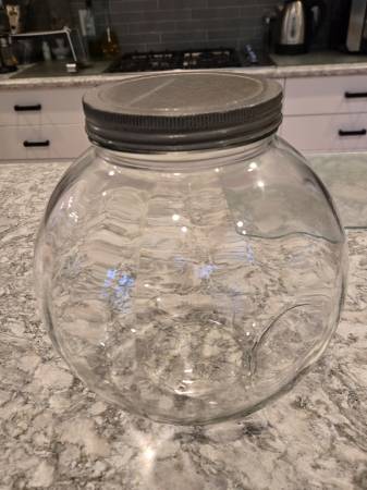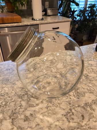 Offering this unique, vintage 1970's "penny" candy jar or cookie jar. It is designed with a slanted opening, with screw-top cover, allowing it to rest on its side for easy access to its yummy contents. It can also stand upright. This has been in the family for over 50 years.