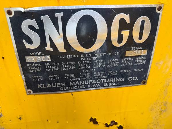 1996 SnoGo WK-800 Snow Thrower, well maintained, works great. • SERIAL #3641 • ENGINE: Cummins DIESEL • HOURS: 333 • ACS HITCH: MODEL PS30-721 D XT
