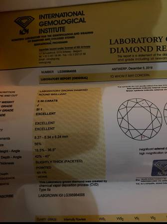 I am looking to sell my lab grown engagement ring, I have the certification and am happy to meet at a jeweler to verify authenticity. $4,250 or Best offer. Willing to consider trade, for price alone the gold