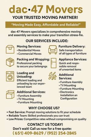 Are you ready to make your next move stress-free? Look no further! Dac▪︎47 Movers specializes in comprehensive moving and assembly services tailored just for you.