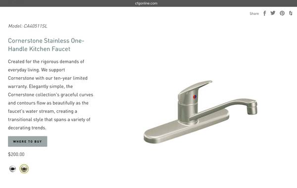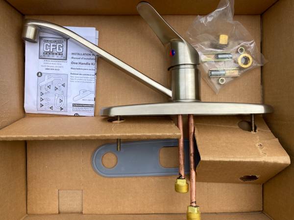 New, not previously installed faucet: Cleveland cornerstone, model 40511SL, a current model listed at $200 (see last pic from Cleveland Faucet website). The finish is like a brushed nickel, not the cheapy chrome stuff. I had gotten this, but ended up installing a different faucet for reasons I don’t remember. Probably wanted one with higher clearance so I could fill water jugs. Anyway, has everything needed for installation, including the papers. I just want to get the $50 I paid for it a few years ago. Email with questions, serious inquiries only.