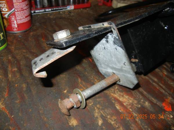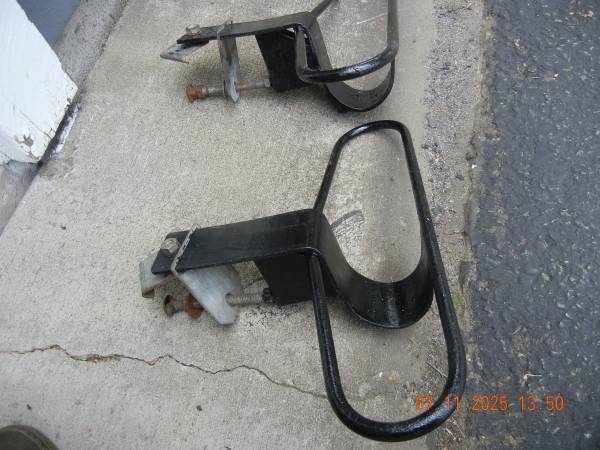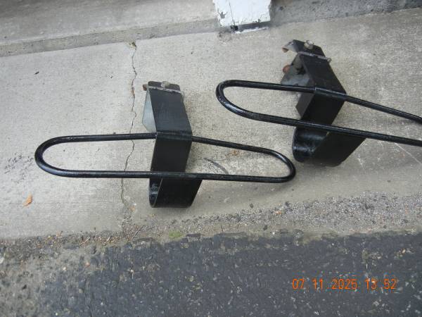 Heavy duty steel carrier that clamps to older style bumpers. The cavity for the motorcycle wheel is 19 inches long, by 5 inches deep, by 4 inches wide. Cash only $25