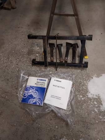 custom made motorcycle jack lift fixture w/legs that attaches to bottom of bike held in place with a rod that passes thru the never designed center stand bracket holes.