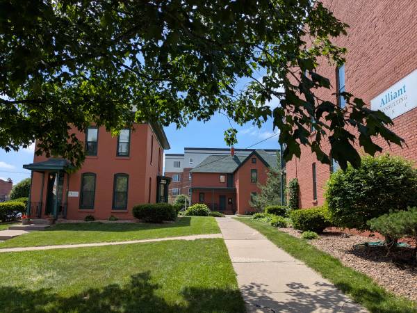 Restored circa 1890 buildings with free parking, modern interiors, mature trees/greenspace, and abundant natural light.
