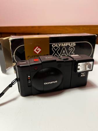 Olympus XA2 rangefinder point & shoot 35mm film camera. Includes flash accessory, original box, and hard case. Hard case hinge was broken many years ago. Lens is dynamite for this sought-after point & shoot. $125 OBO