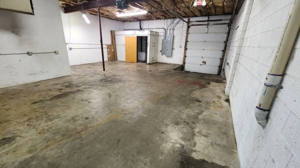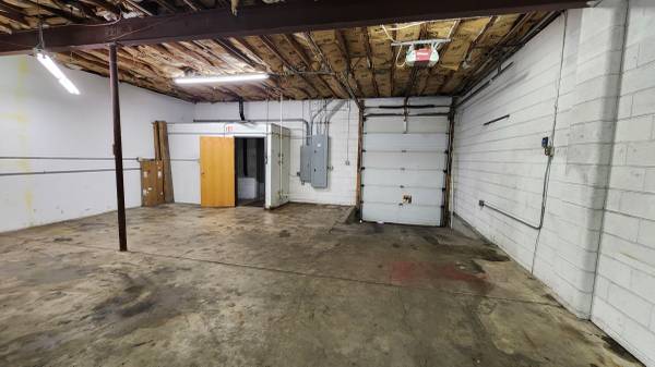 The property features a front showroom/office area with a private restroom, plus a rear warehouse with a grade-level overhead door.