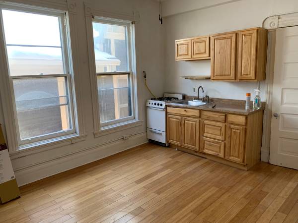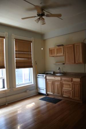There is a laundry room in the basement, and a storage locker in the basement for $25/month pending availability. Street parking only. The room is on the 2nd floor, faces East, has tall ceilings, large windows, and newer kitchen cabinets.