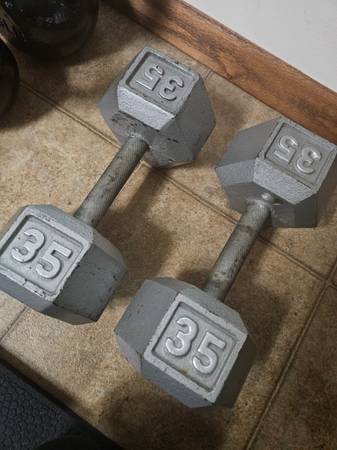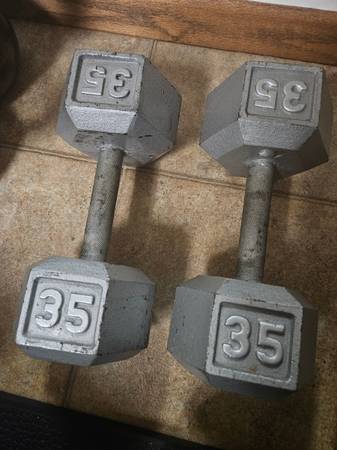 Pair of 35 lb iron hex dumbbells. Good knurling. No rust. $60 cash Also have pairs of 25 and 15 lbs for sale
