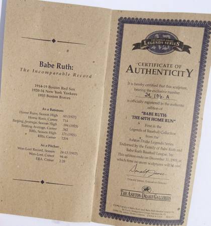 Ashton Drake - Babe Ruth: 60th Home Run-The Legends Series 1994, Baseball Figure Sculpture Statue