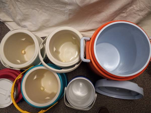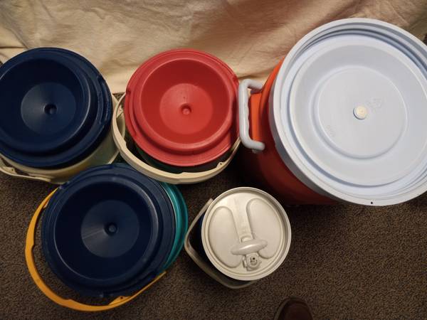 +Rubbermaid 5 Gal. Drinking Water Cooler W/ Despenser. Model # 1685 Heavy Duty. $20. +2 - Igloo 2 Gal. Water Drink Coolers W/Despenser. White W/Blue Lid. $15 each. +Igloo 2 Gal. "Barrel of Fun"...