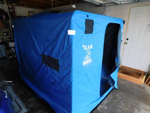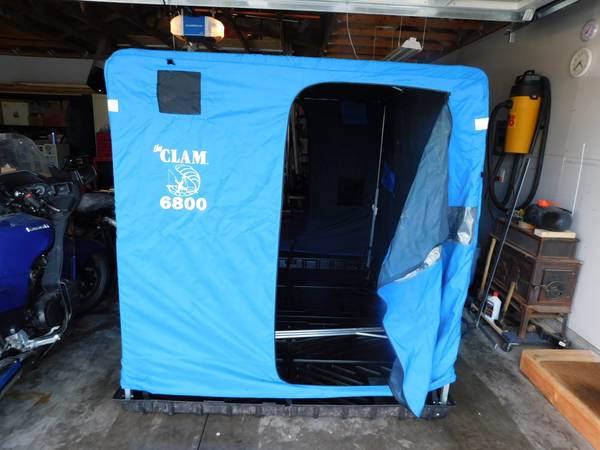 Clam 6800 Ice Shack - Pop Up Suitcase style with some minor extra ventilation by the house mouse - see pics Moderate use