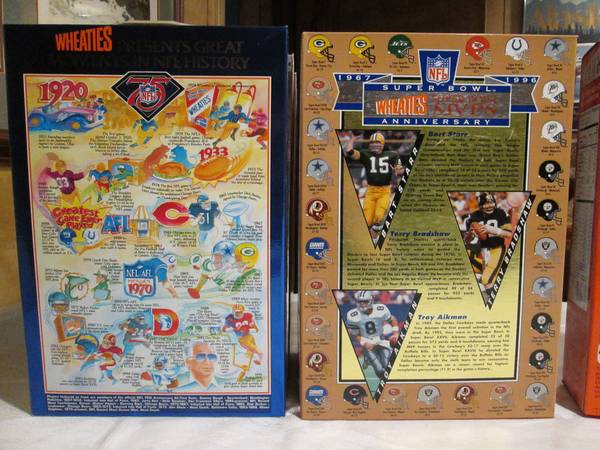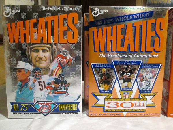 This rare pair includes Wheaties boxes (1) 75th Anniversary of the NFL, and (1) 30th Anniversary of the Super Bowl. Perfect condition. Includes cereal and neither have ever been opened. I will only respond to emails that include your name and phone number. Both for $5. What a deal!! CASH ONLY. Thanks! Search 'bevintage' for more vintage bargains.