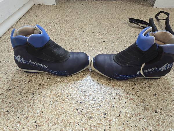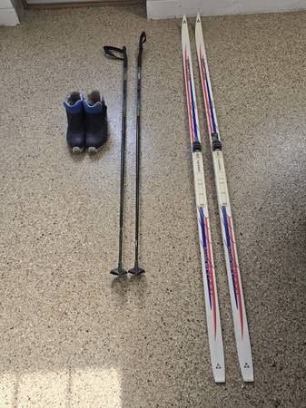 (SOLD) - Two Fischer X-Country Skis 210 cm long. Waxless Salomon Bindings Two Solomon Quick Connect Ski Boots - Size 10 Two Exel Ski Poles Casually used and in good condition. Great starter set....