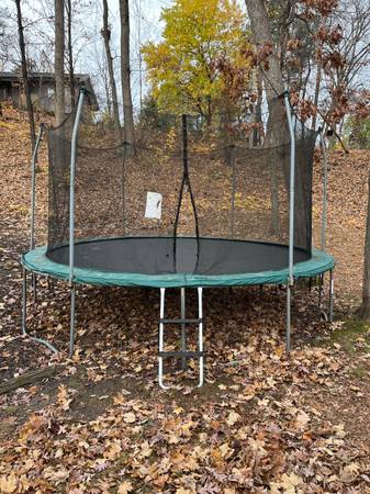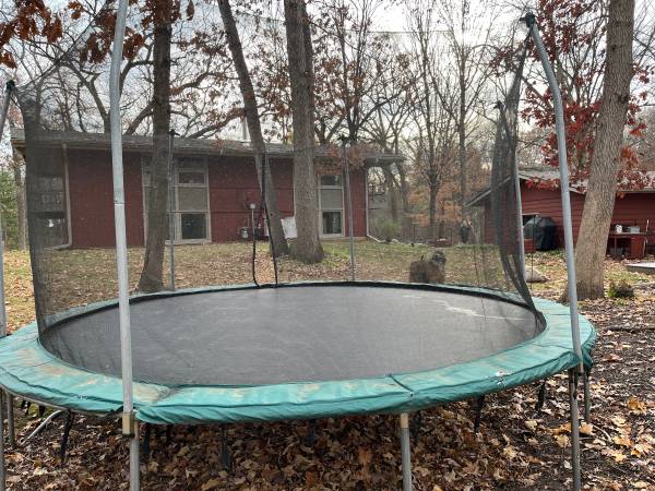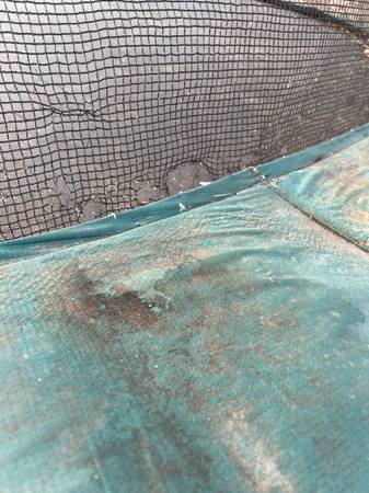 8 yr old trampoline. Located in North Oaks, MN. Except for the frame, the trampoline is taken in each winter. 15-foot wide by 9-foot tall with safety netting. 13-foot inner diameter inside the safety netting. Couple of tears in the spring cover fabric and one small hole in the safety netting. See pics. Otherwise it is in good condition.