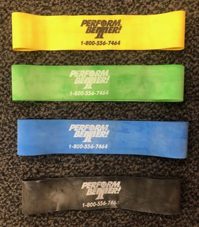 Perform Better Exercise Resistance Bands (selling in sets of 4) yellow (light), green (medium), blue (heavy), black (extra heavy) 9" L x 2" W• $10 for a set of 4 (1 of each color)