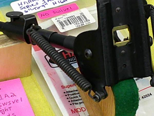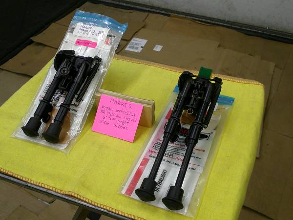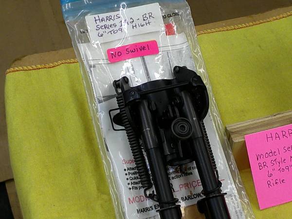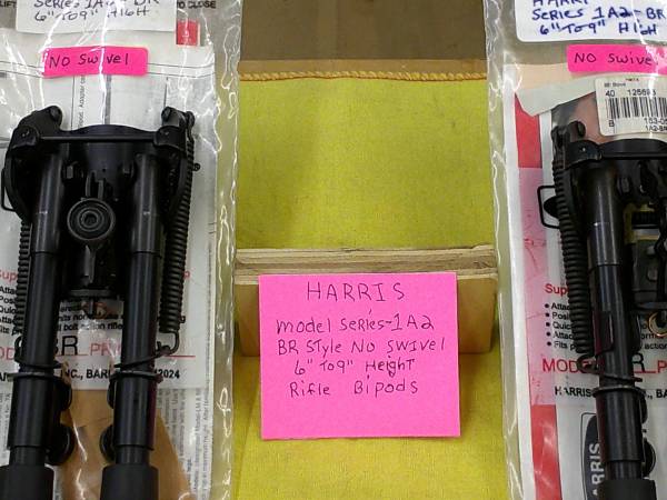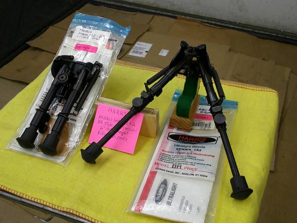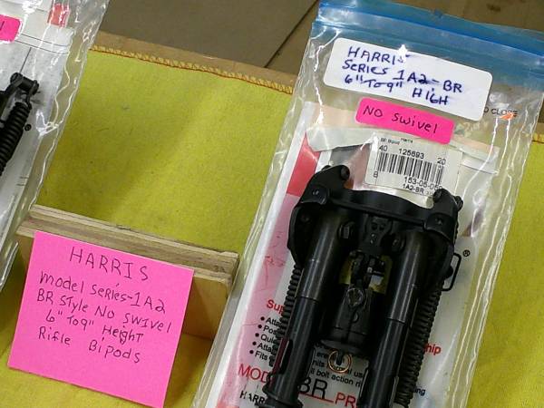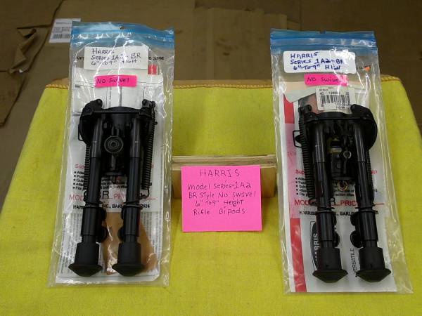 Harris Series 1A-2 BR (no swivel) - Ultralight rifle bipod with working height of 6" to 9" high. I have 2 available for $60/each. They are both in excellent condition. They were used mainly for display purposes. They attach to a rifles front sling swivel stud. I do have a few attachment adapters available for an additional fee. Current price on these is about $85. Cash only. Please call John at show contact info