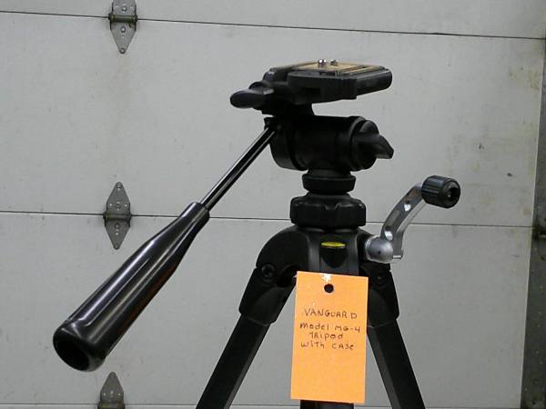 Vanguard model MG-4 tripod with case in like new condition. It has a minimum height of 23" and a maximum height of 63". It features a bubble level along with a crank for height adjustment. This tripod features traditional clamp locks on the leg extensions along with twist lock rings on all the moveable joints. I used this mainly for display purposes. The case has a side pocket for storing the shoulder strap. This is a very stable tripod. Cash only. Please call John at show contact info