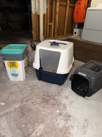 Includes: Liter box, Electric cat feeder, Carrying cage, 5 pounds of food, Cat liter, toys!