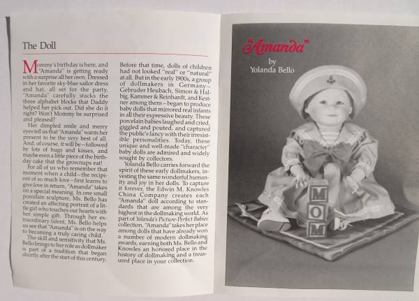 Vintage Ashton Drake Galleries AMANDA Porcelain Doll by Award Winning Artist Yolanda Bello.