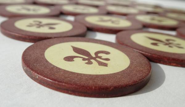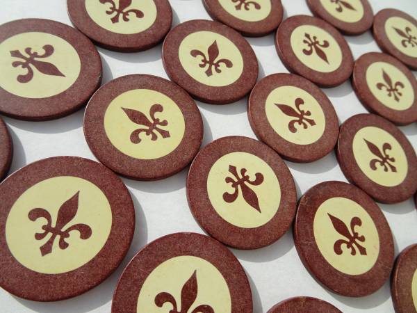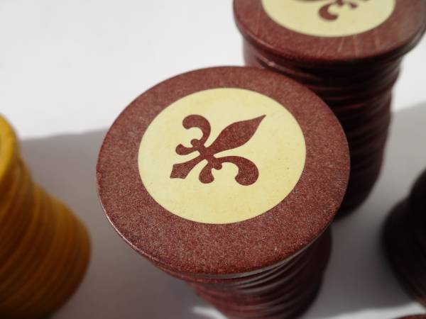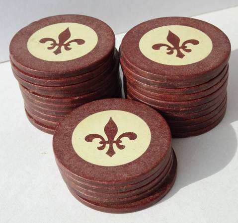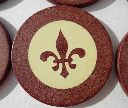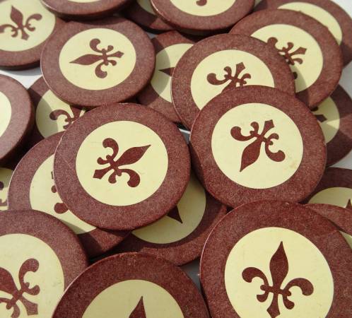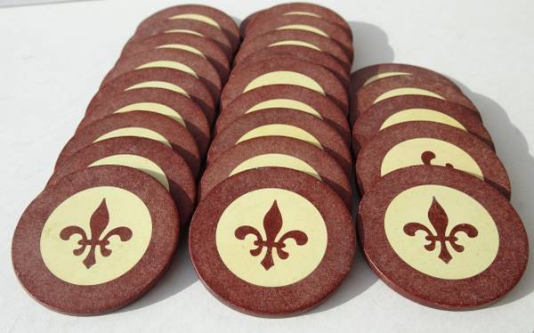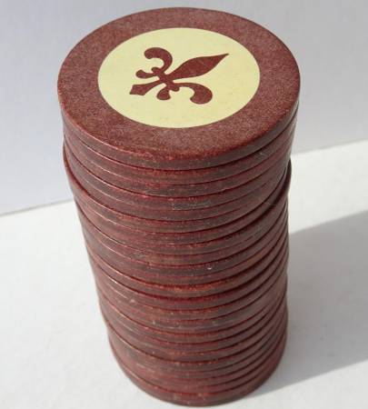 A set of 25 beautiful inset Antique Vintage Fleur-De-Lis Clay Poker Gambling Gaming Chips from the early 1900s.